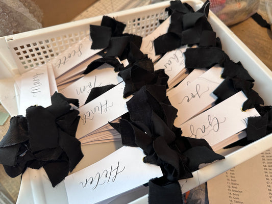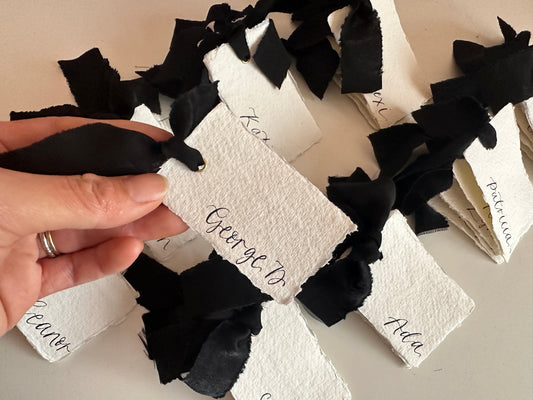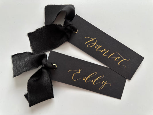 BLACK Place Card Chiffon Ribbon | Calligraphy Wedding Place Name Card | Gold or Silver Eyelet