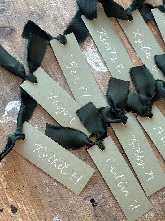 FOREST GREEN Satin Ribbon Calligraphy Place Name Card | White Calligraphy Wedding Place Name Card | Gold or Silver Eyelet