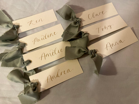 CHAMPAGNE Chiffon Ribbon Calligraphy Place Name Card | White Calligraphy Wedding Place Name Card | Gold or Silver Eyelet