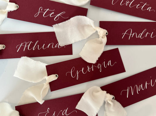 BURGUNDY + CHAMPAGNE Place Card Chiffon Ribbon | Calligraphy Wedding Place Name Card | Gold or Silver Eyelet
