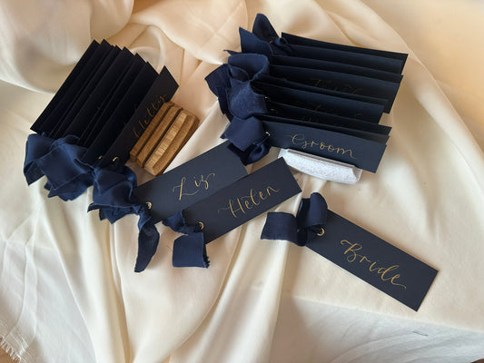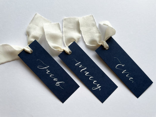 NAVY Place Card Chiffon Ribbon GOLD Calligraphy | Wedding Place Name Card | Gold or Silver Eyelet