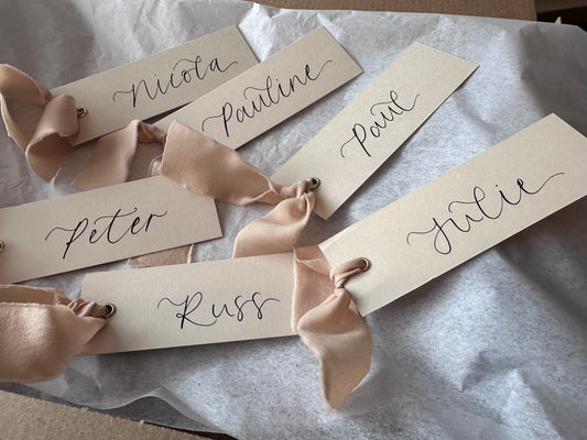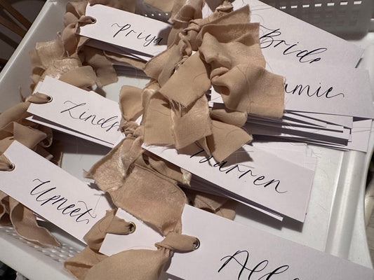 NUDE Chiffon Ribbon Calligraphy Place Name Card | White Calligraphy Wedding Place Name Card | Gold or Silver Eyelet