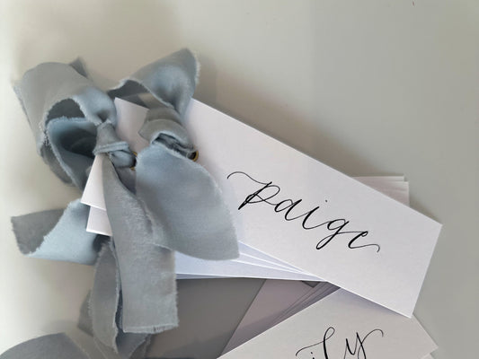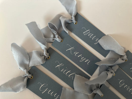 DUSKY BLUE Chiffon Ribbon Calligraphy Place Name Card | White Calligraphy Wedding Place Name Card | Gold or Silver Eyelet