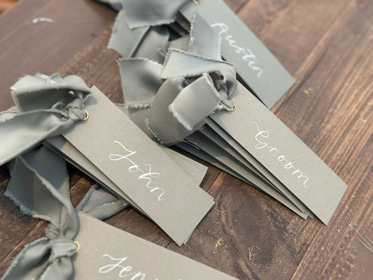 EUCALYPTUS + SAGE Satin Ribbon Calligraphy Place Name Card | Calligraphy Wedding Place Name Card | Gold or Silver Eyelet