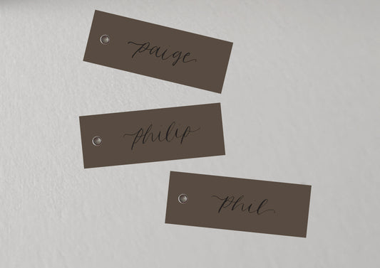 CHOCOLATE BROWN Calligraphy Place Name Card | DIY Add Own Ribbon Calligraphy Wedding Place Name Card | Gold or Silver Eyelet Place Card