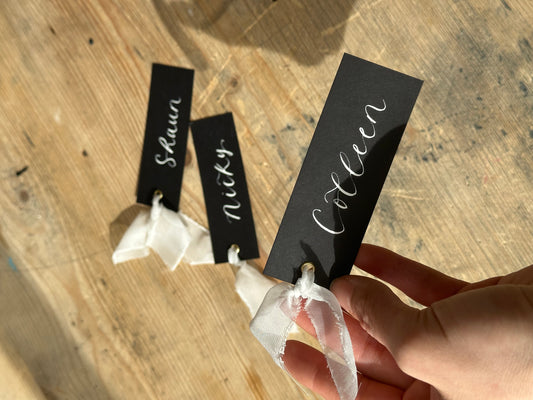 BLACK + BUTTER Linen Ribbon Calligraphy Place Name Card | Black Calligraphy Wedding Place Name Card | Gold or Silver Eyelet