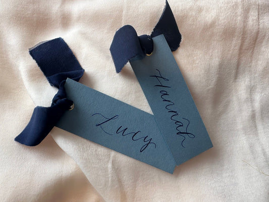 DUSKY BLUE + NAVY Place Card Chiffon Ribbon | Calligraphy Wedding Place Name Card | Gold or Silver Eyelet