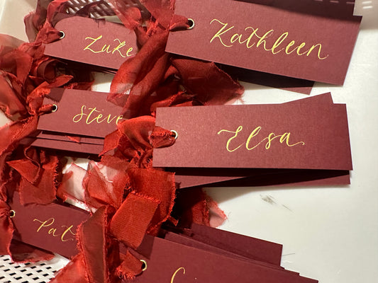 BURGUNDY + WINE Square *ish Place Card Chiffon Ribbon | Calligraphy Wedding Place Name Card | Gold or Silver Eyelet