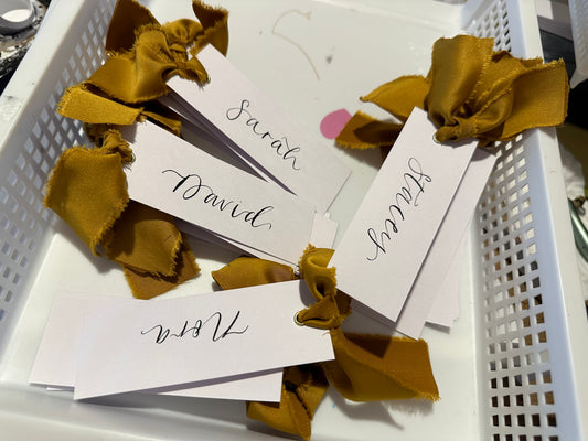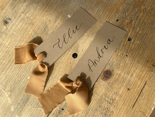 OCHRE Place Card Chiffon Ribbon | Calligraphy Wedding Place Name Card | Gold or Silver Eyelet