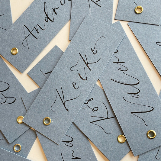 DUSKY BLUE Calligraphy Place Name Card | DIY Add Own Ribbon Calligraphy Wedding Place Name Card | Gold or Silver Eyelet Place Card
