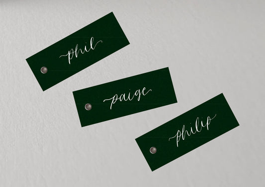 FOREST GREEN Calligraphy Place Name Card | DIY Add Own Ribbon Calligraphy Wedding Place Name Card | Gold or Silver Eyelet Place Card