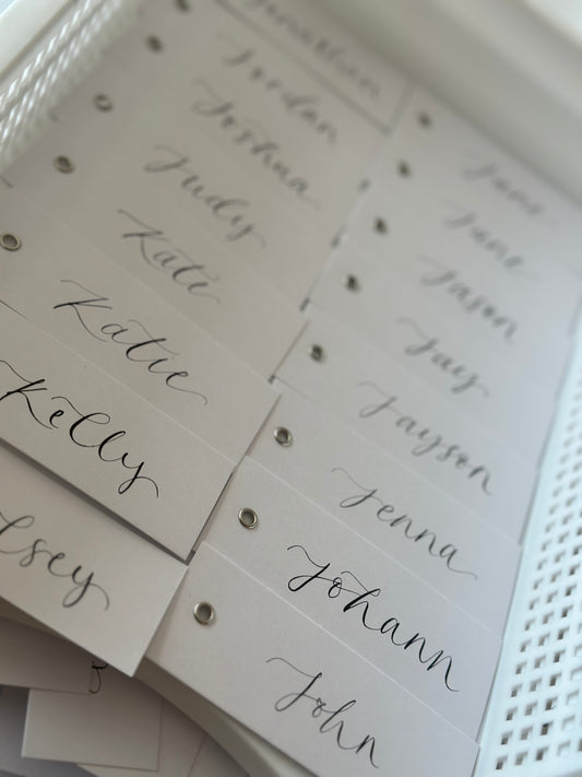 BUTTER Ribbon Calligraphy Place Name Card | White Calligraphy Wedding Place Name Card | Gold or Silver Eyelet