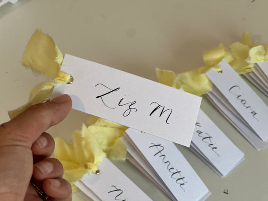 LEMON Chiffon Ribbon Calligraphy Place Name Card | Opaque Calligraphy Wedding Place Name Card | Gold or Silver Eyelet