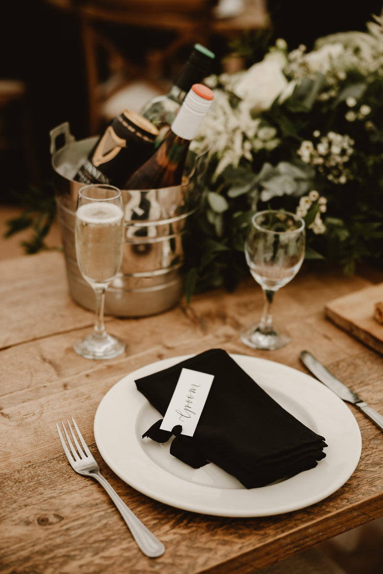 BLACK + BUTTER Linen Ribbon Calligraphy Place Name Card | Black Calligraphy Wedding Place Name Card | Gold or Silver Eyelet