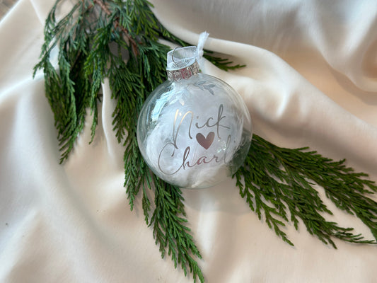 Personalised White Feather Couple Name Bauble: Glass Remembrance Ornament [Anniversary Engagement Wedding Gift Proposal]