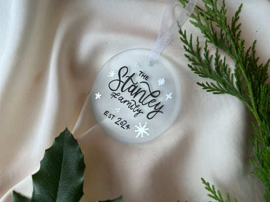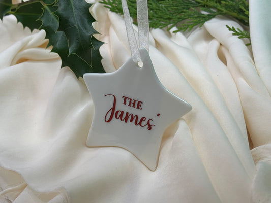 Personalised Family Name Christmas Ornament: Ceramic, Star or Frosted Glass Bauble [Anniversary Engagement Wedding Gift Proposal]