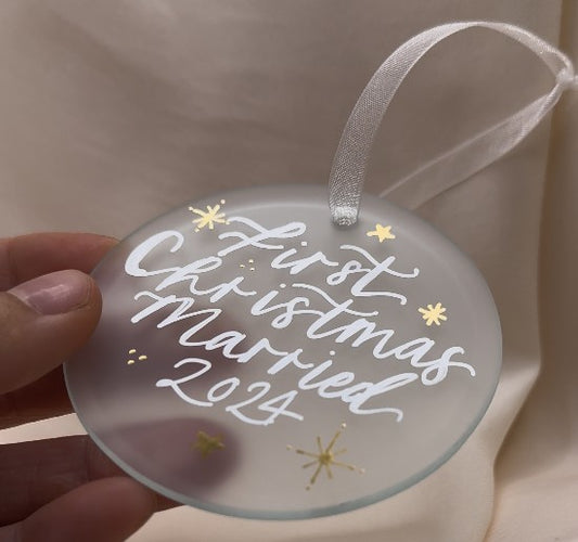 Handwritten Calligraphy Newlywed Christmas Ornament: Ceramic, Star or Frosted Glass Bauble [Anniversary Engagement Wedding Gift Proposal]