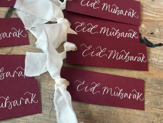 5 PACK Eid Mubarak Calligraphy Ribbon Gift Tag: Eid al-Fitr Celebration, Ramadan, Dinner, Party, Place Card
