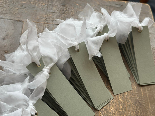 25 BLANK IVORY Chiffon Ribbon Place Card with Eyelet | DIY Wedding Dinner Party Place Card, Write Your Own Place Setting | Green Wedding Baby Shower