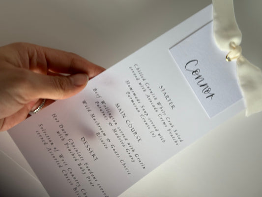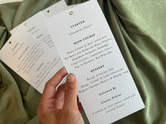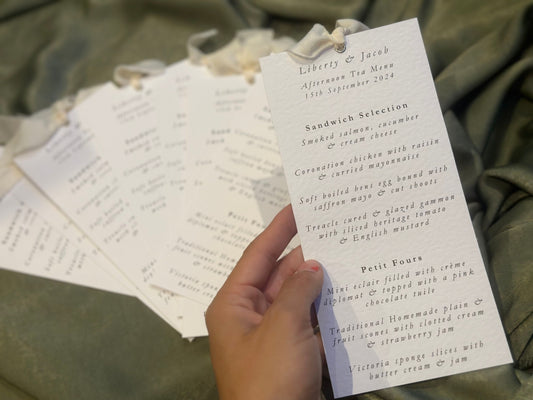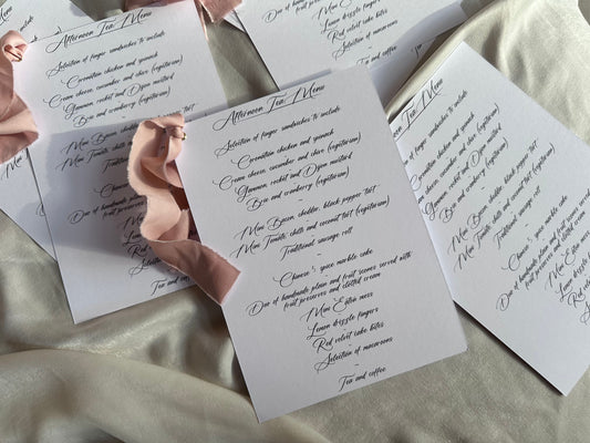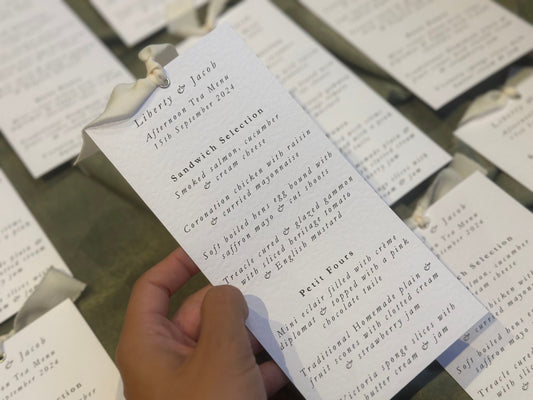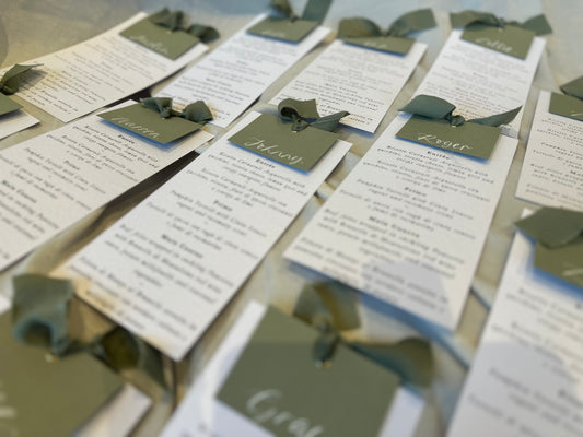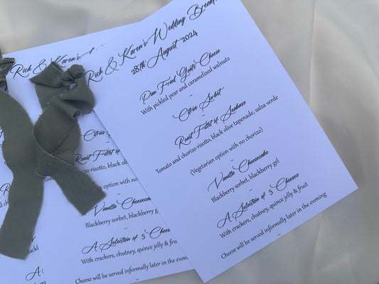 DIY Add your own ribbon Printed Skinny Menu Card | Custom Printed Calligraphy Wedding Menu Skinny Card | Personalised Wedding Menu Card