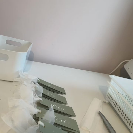 [ Stunning, high quality personalised tag wedding place name cards, a brilliant finishing touch to your table décor. A lovely personal addition to help your guests find their seats, personalised with calligraphy. Our personalised wedding place name cards are hand lettered with a name or phrase of your choice! These place name cards are simply stunning and make lovely table decorations at your wedding ]