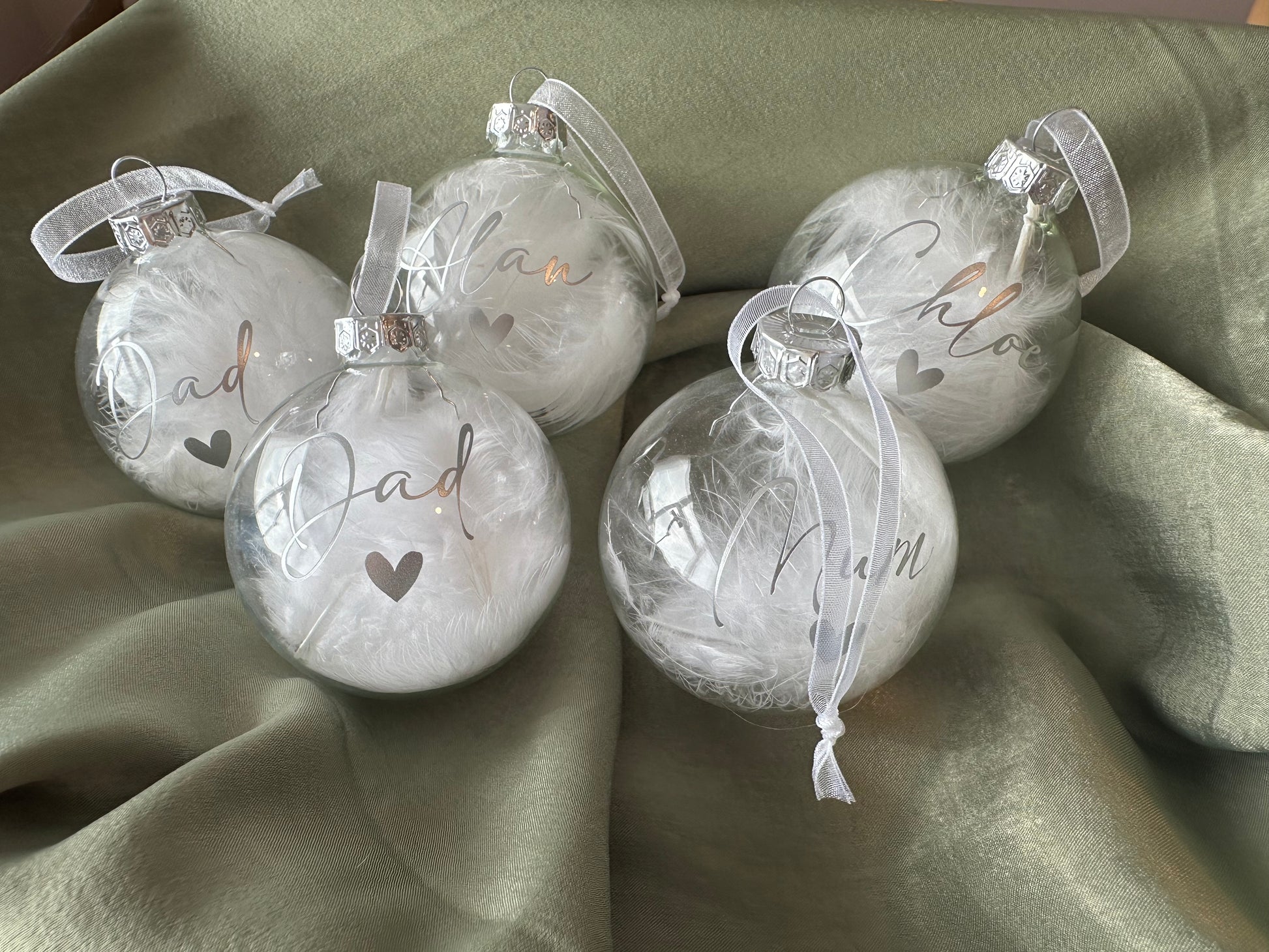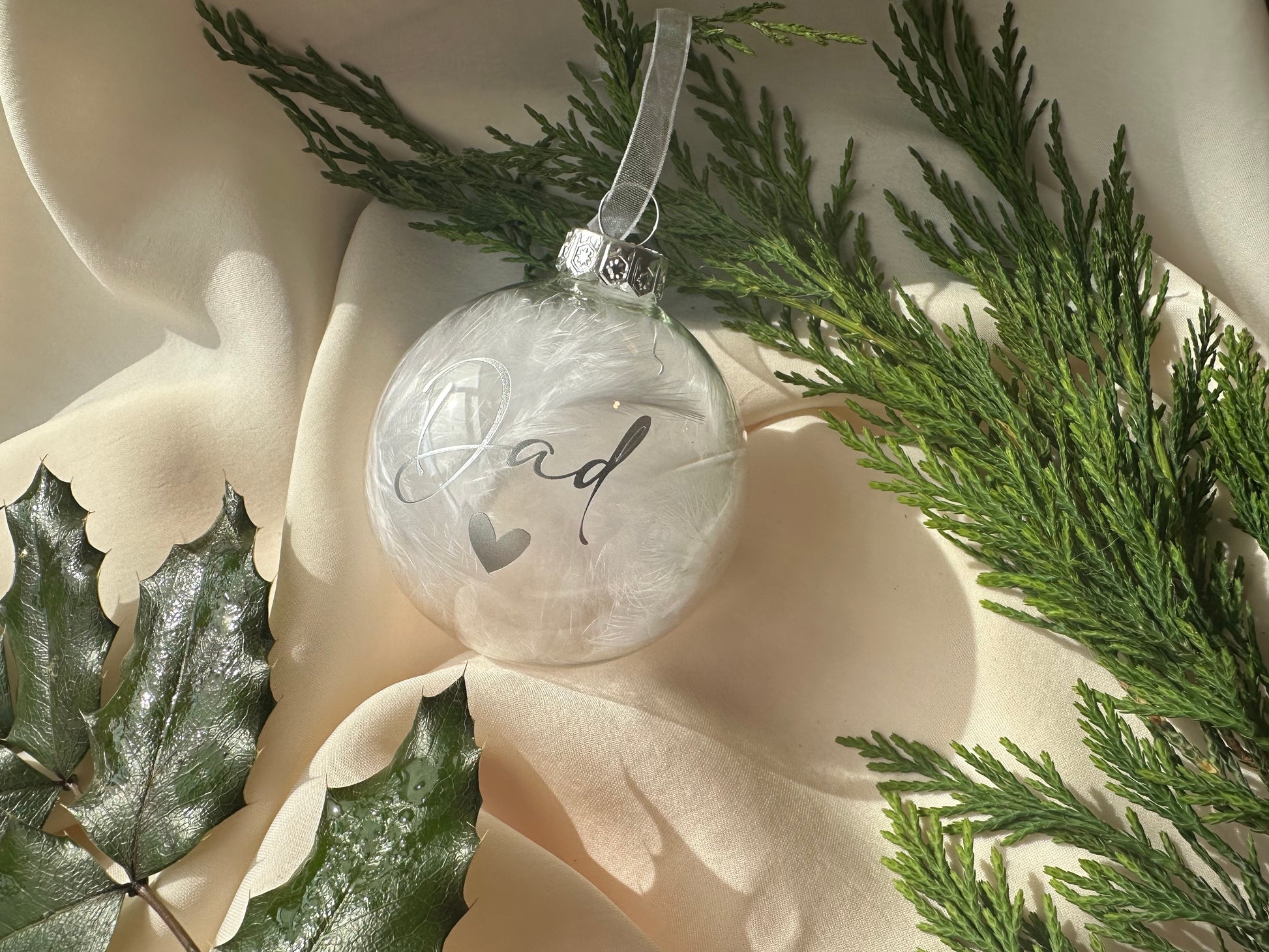 christmas memorial bauble, feather filled glass bauble, personalised remembrance ornament, parent loss ornament, grandparent loss ornament, child loss memorial, sympathy christmas gift, luxury glass bauble, memorial tree ornament, personalised keepsake, grief gift ornament, remembrance christmas decoration, feather memorial ornament, bereavement gift, christmas memory ornament, handmade christmas bauble, personalised sympathy gift, memorial hanging decoration, lost loved one ornament, festive remembrance gift