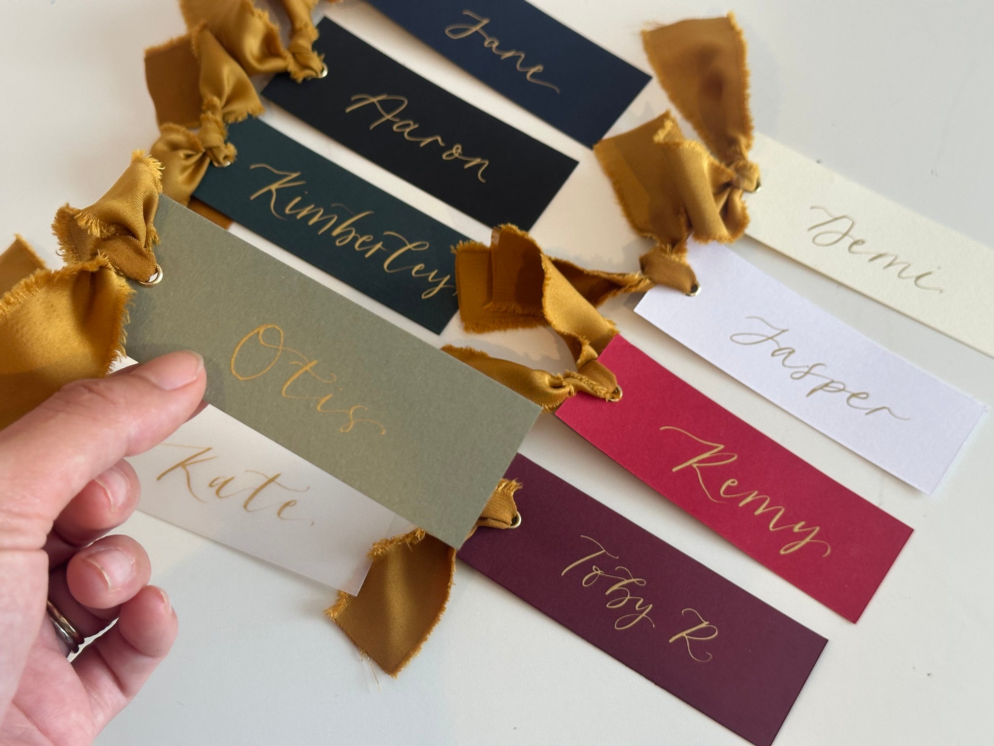 Bring elegance and a festive glow to your table with our handwritten calligraphy place cards, finished with a luxurious gold satin ribbon. Each card is carefully written in gold ink, adding a refined touch that complements any festive colour scheme.