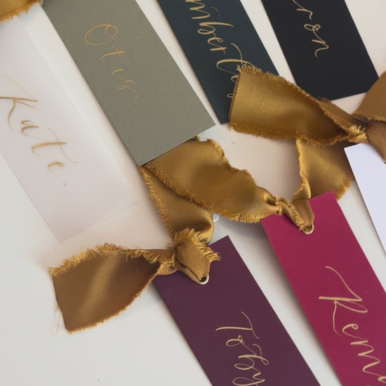 Handwritten Calligraphy Place Cards with Gold Satin Ribbon | Personalised Festive Table Décor