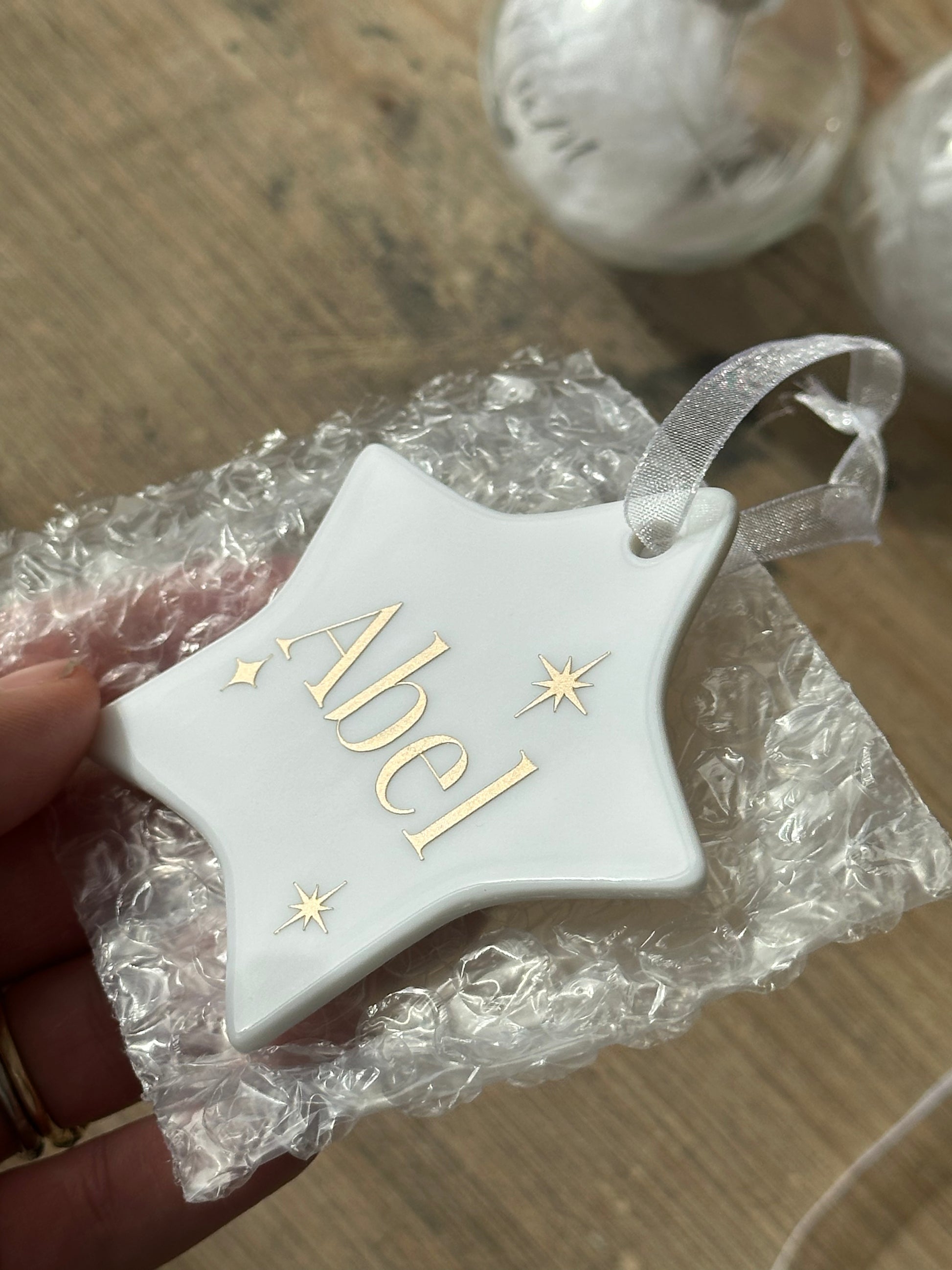 Celestial Star Christmas Ornament | Personalised Baby’s First Christmas Bauble | Custom Name Ceramic or Glass Tree Decoration
