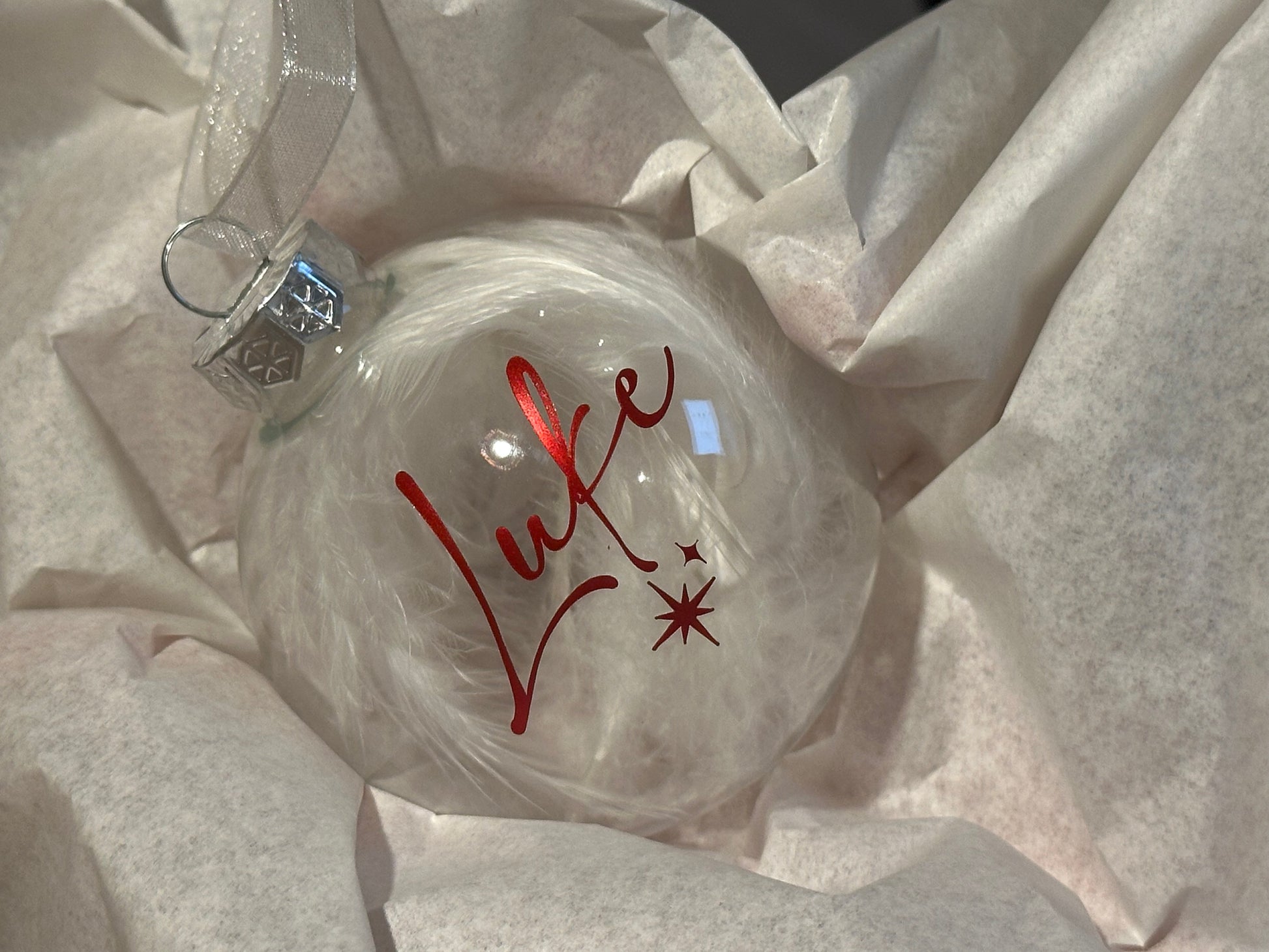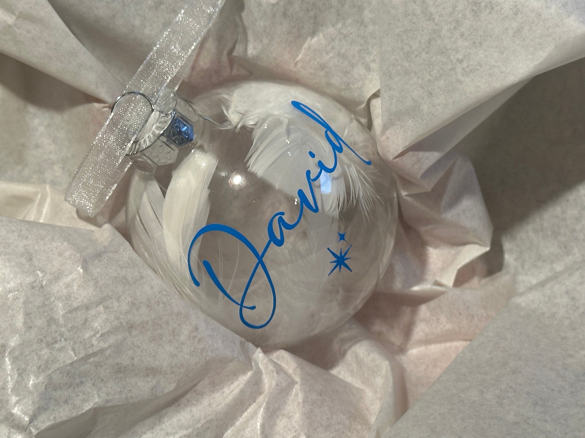 christmas memorial bauble, feather filled glass bauble, personalised remembrance ornament, parent loss ornament, grandparent loss ornament, child loss memorial, sympathy christmas gift, luxury glass bauble, memorial tree ornament, personalised keepsake, grief gift ornament, remembrance christmas decoration, feather memorial ornament, bereavement gift, christmas memory ornament, handmade christmas bauble, personalised sympathy gift, memorial hanging decoration, lost loved one ornament, festive remembrance gift